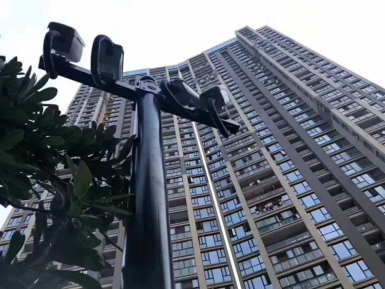 居民住宅小區(qū)樓由于位置、樓層、朝向、間距等關系,對高空拋物監(jiān)控攝像頭的安裝位置以及綜合布控提出較高的要求。要使得攝像機能監(jiān)控的范圍能覆蓋監(jiān)控樓層的陽臺,需要考慮攝像機的立桿位置,它決定了攝像機的視場,同時要求攝像機必須有較大的水平視角以及變焦功能,以協(xié)同達到更好的監(jiān)視范圍,而且攝像機的清晰度也很重要,必須保證能看得清高空拋物的樓層,為AI行為檢測提供數(shù)據(jù)源。